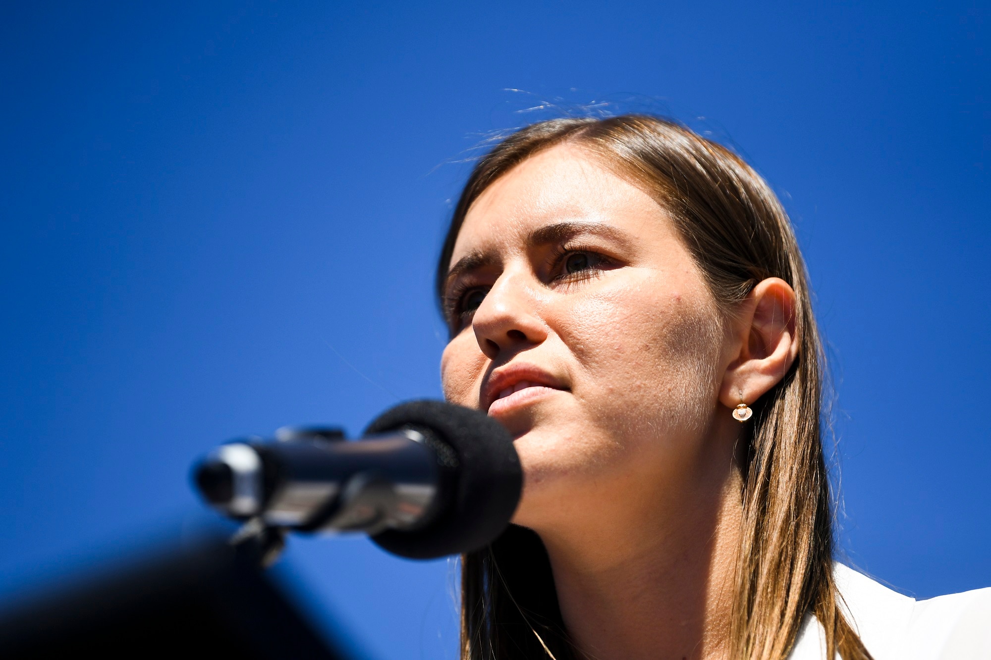 Brittany higgins speaks at the march 4 justice protest outside parliament house.